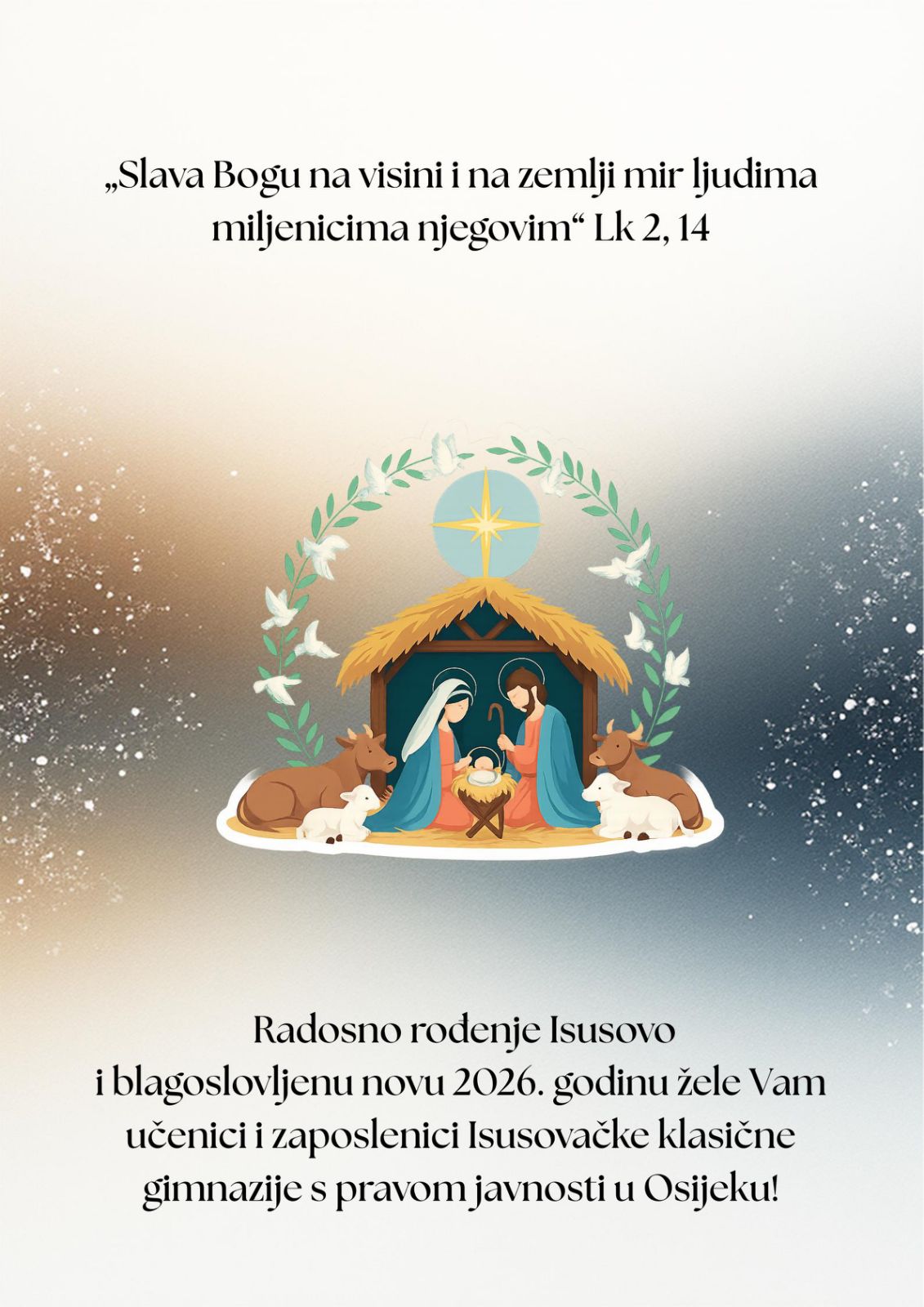Blagoslovljen Božić i Božjim mirom ispunjenu Novu godinu od srca želimo svim našim učenicima, sadašnjima i bivšima, roditeljima, braći i sestrama, bakama i djedovima, te prijateljima i dobročiniteljima IKG-a.